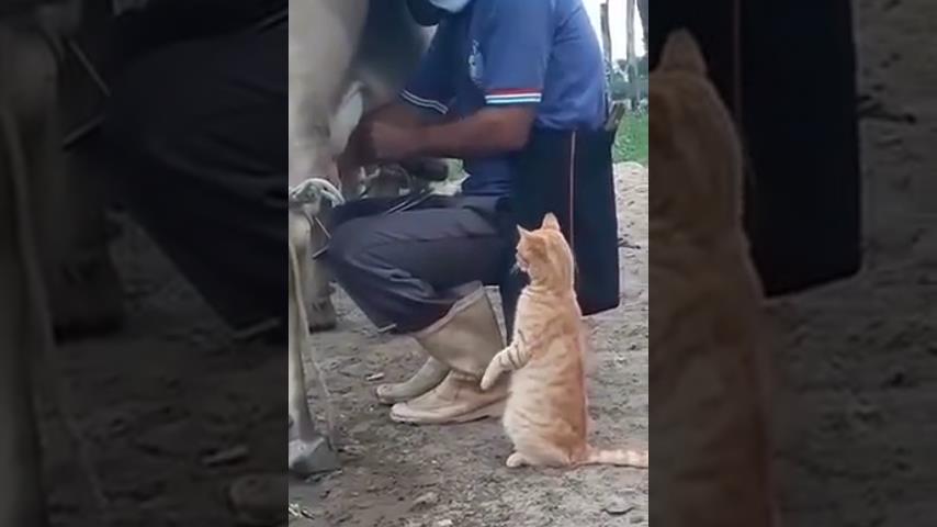 因為它的主人正在擠奶, 一隻貓堅持喝她最喜歡的新鮮牛奶.