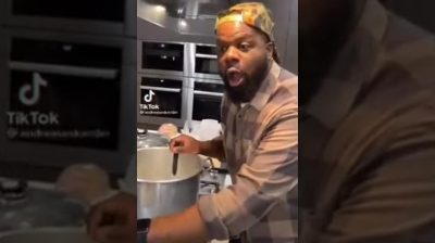 作為廚師做飯, 一個男人假裝把番茄醬扔進他的意大利面.