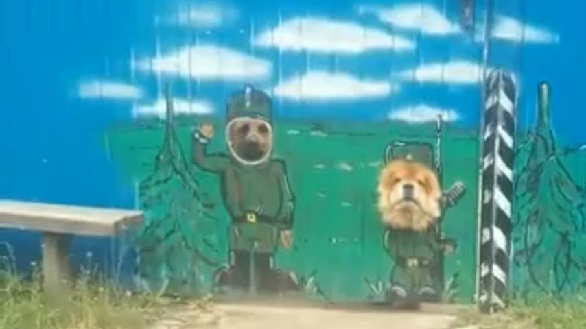 一所房子的主人在他的柵欄上畫了兩個非常有趣的士兵形象, 並為他的狗頭開了兩個洞.