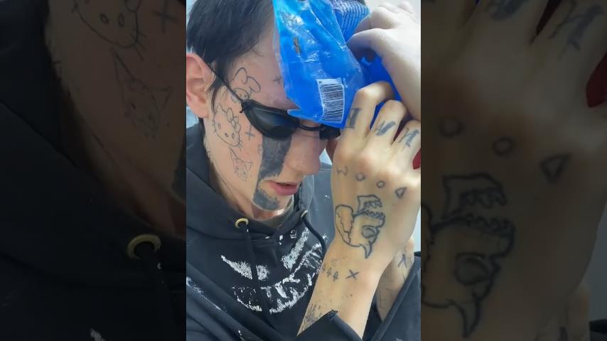一個男人在紋身去除診所, 抹去他年輕時臉上的紋身.