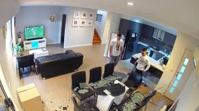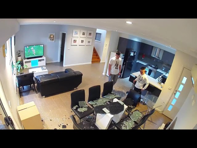 在墨爾本澳大利亞, 一個年輕人在房子的客廳裡移動一張圓形玻璃桌. 圓桌略微靠在一張同樣由玻璃製成的桌子的一個角上, 然後碎成一千塊.