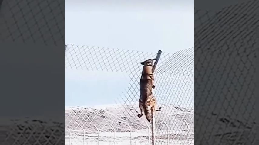 一頭狼靈巧地爬上高高的鐵絲網.