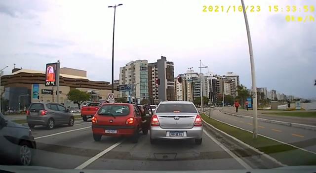巴西弗洛里亞諾波利斯市, 兩名司機在路上發生爭執. 兩輛車並排停, 一個人在另一個人的車上敲他的門.