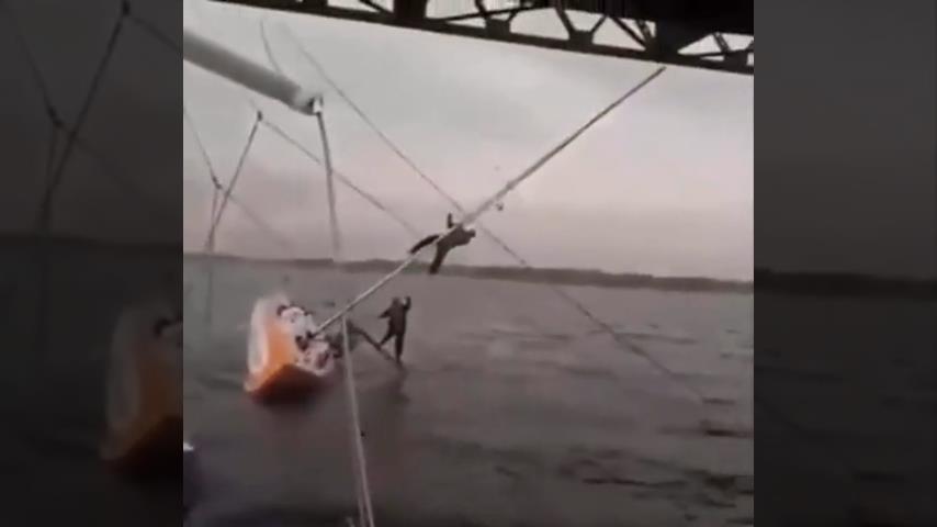 一艘帆船上的三個俄羅斯人從一側減輕體重, 所以船傾斜,他們從一座低矮的橋下通過.