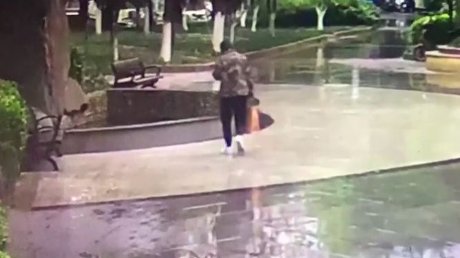 在中國的一個城市, 一個男人走路時眼睛盯著手機, 最後掉進公園裡的一個小人工湖里.