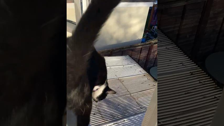 一隻貓從窗台上跳下來刺穿屋頂. 幸運的是, 很好.