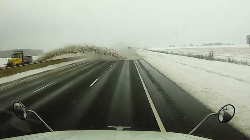 2022 年 1 月 22 日在美國俄亥俄州的 I-80 高速公路上, 一台除雪機的刀片抬得太高, 在迎面而來的溪流中向遠處扔雪. 大雪造成事故,對另一側車輛造成損壞.