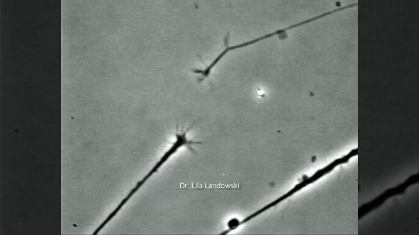 這是神經科學家Lila Landowski在顯微鏡下的實驗室培養容器中拍攝的視頻. 兩個神經元,就像我們在大腦和整個身體中的神經元一樣, 希望連接到空間中的其他神經元. 最終,他們彼此聯合起來. 影片已加速 – 這一過程發生在 20 分鐘內.
