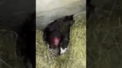 在俄羅斯的一個馬厩裡, 一隻母雞看著三隻剛出生的小貓.