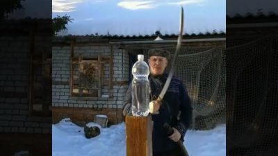 哥薩克展示了他的劍的質量, 將一瓶水切成碎片.