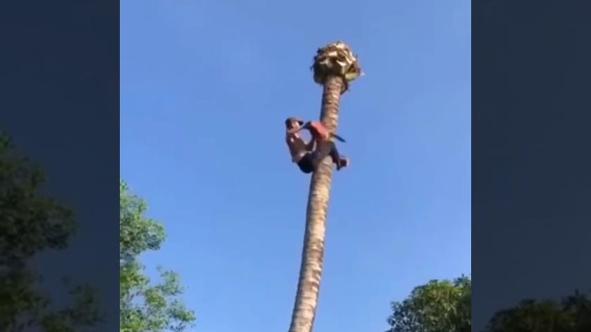 只用他的腿來支撐, 一個人逐漸用電鋸砍一棵棕櫚樹.