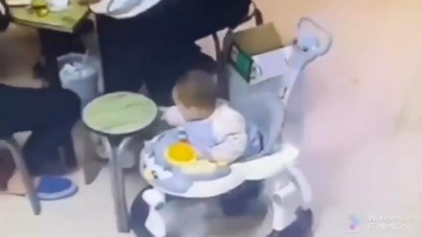 軍隊中的一個嬰兒通過移動她站立的凳子來惡作劇一個女人.