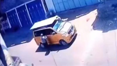 兩名男子試圖用繩子將木板綁在車頂上, 但是絞索落在了當時路過的摩托車手的頭上.