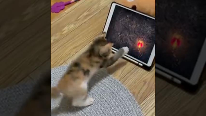 一隻小貓正在給貓玩玩具, 在平板電腦的屏幕上追逐昆蟲和老鼠.