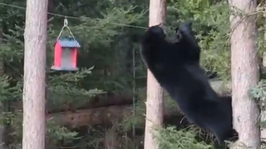 一隻熊爬上一根繩子, 用大麻抓住餵食器.