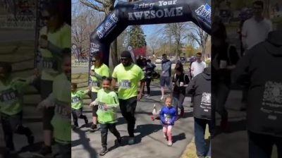 一隻鴨子玩得很開心,在長島馬拉鬆比賽中獲得獎牌, 在紐約城.