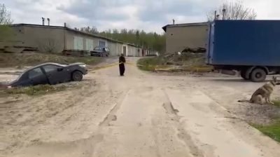 試圖拖走陷在泥裡的汽車, 從第二輛車. 有人想了個壞主意,打結...