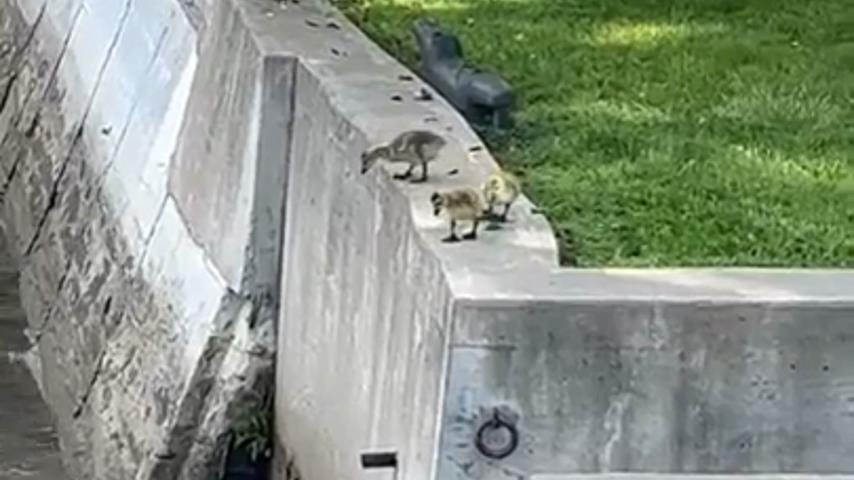 當鵝試圖通過跳下高牆來接近它們的媽媽時, 他們中的一個會找到更安全的方法.