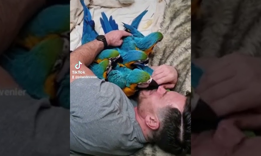 哦,約翰·德維尼爾, 擁有6只來自南非的澳門鸚鵡, 讓他最喜歡的寵物入睡.