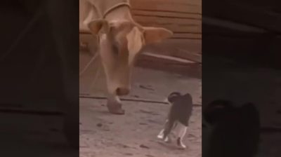 渴了的貓,直接從母牛的乳房喝新鮮的牛奶.
