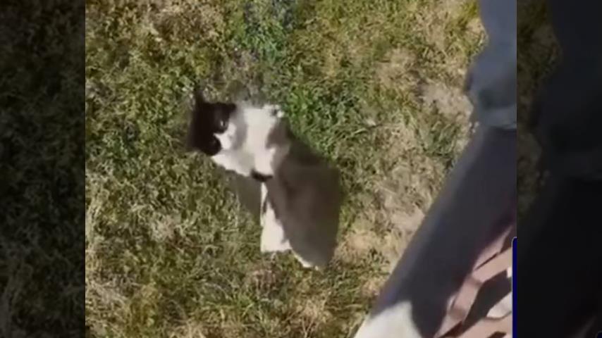 一隻貓學會了快速上樓的方法, 抓著一條綁在繩子上的毛巾.