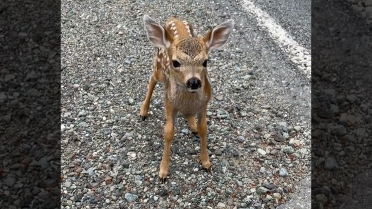 當他和媽媽在一起時, 一隻小鹿在美國路邊接近一個男人,突然躺下, 讓他撫摸它.