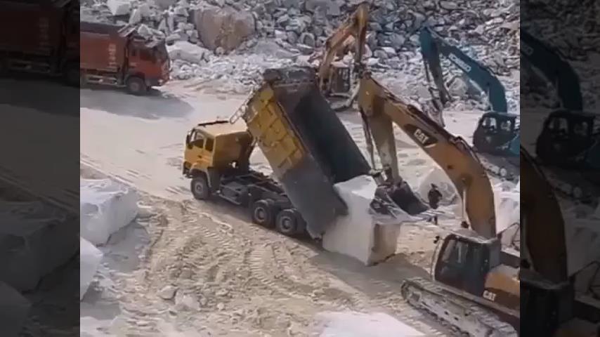 在採石場, 挖掘機的操作員試圖將一塊大石頭裝入自卸車的鏟斗. 看到他在掙扎, 另外兩台挖掘機的操作員來幫忙.