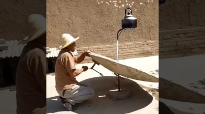 一個人在茶壺裡燒水, 將它放在拋物面鏡上方.