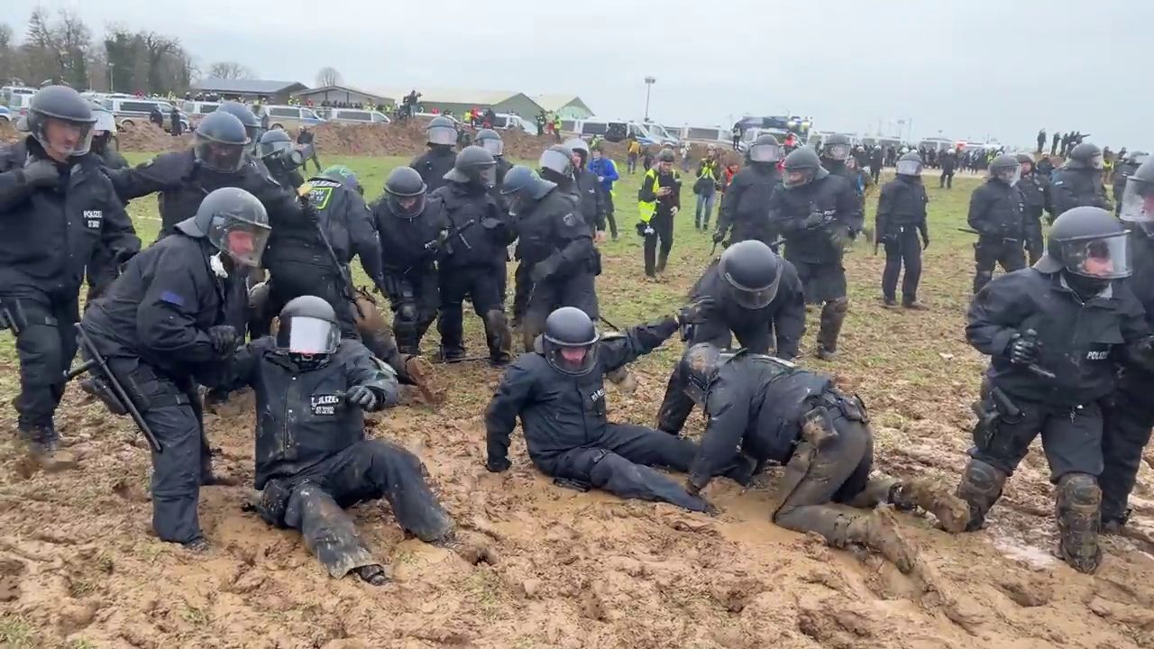 2023 年 1 月 14 日,星期六,在德國 Lützerath 舉行的環保示威活動中, 除了抗議者,警察還得對付泥漿. 當他們的腳陷在泥裡時,他們中的幾個人掙扎著移動. 抗議者反對擴大露天礦和破壞 Lützerath 村.