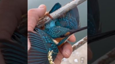 一個男人看到一隻痛苦的翠鳥,它的腿被金屬欄杆上的冰卡住了. 他用雙手溫暖金屬和鳥的腿. 幾秒鐘後, 腿掉了,鳥飛走了.