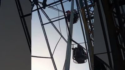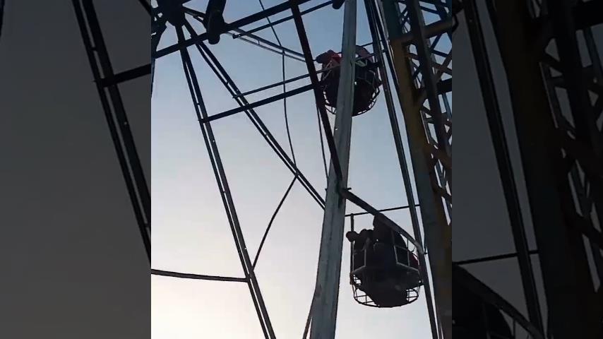 在印度的這個遊樂園裡, 車輪是由人力驅動的. 男子單手抓籃子爬進車輪中央. 然後他踩著橫桿轉動輪子.