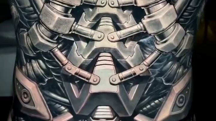 紋身在男人背上的機械骨架設計圖. 紋身是由藝術家完成的