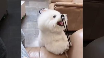一隻狗發明了一種自己玩耍的方法, 從他的鼻子裡射出一根髮帶.