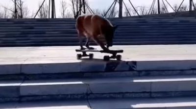 用滑板訓練的狗, 下樓梯.