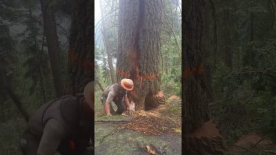 一個伐木工正在測試一種舊的切割技術, 用來直接倒樹. 該技術需要更多。.