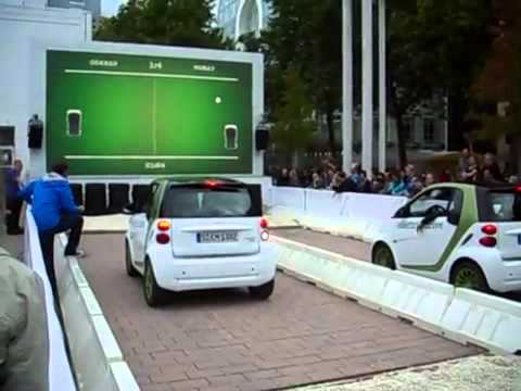 知名的智慧汽車生產公司組織與新電動模型在法蘭克福國際汽車展的乒乓遊戲. 目的是測試電動智慧訪客快,加速.