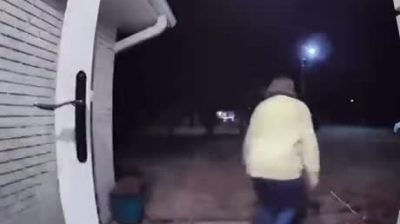 一名男子將高爾夫球放在一名躺在地上的年輕女子的臀部上揮桿。.