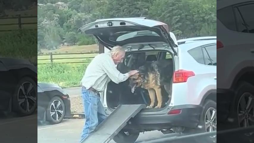 一位老人在後車廂放了一個折疊坡道, 幫助他的老狗上車.
