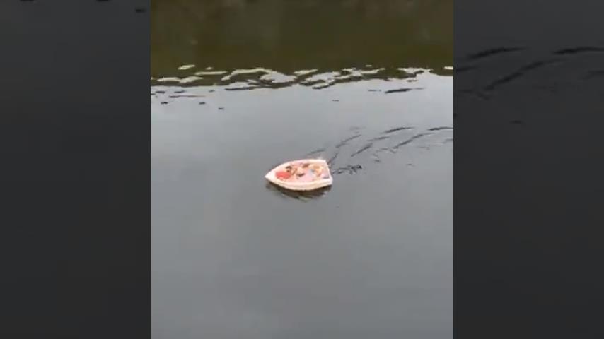 有人在運河裡測試一艘小型遙控船, 突然一條大魚來抓她.