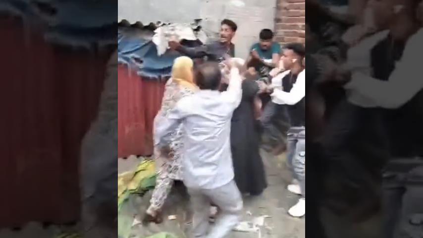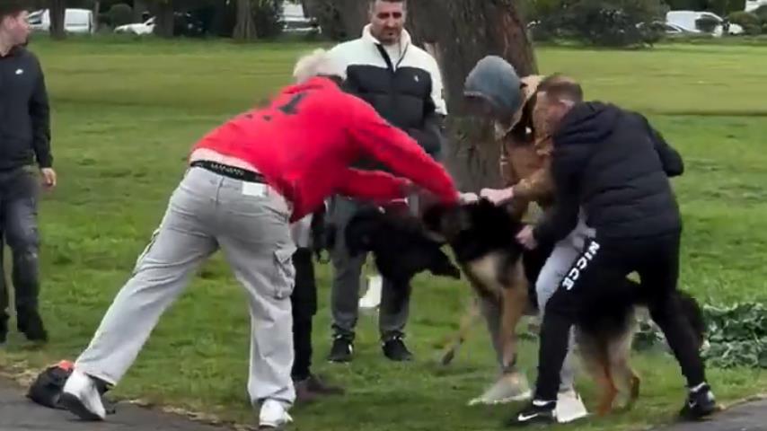 德國牧羊人攻擊一隻小狗, 另外兩隻狗將主人拖到戰鬥中.