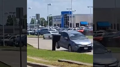 在美國密蘇里州, 當高溫突然變形時,汽車起飛.
