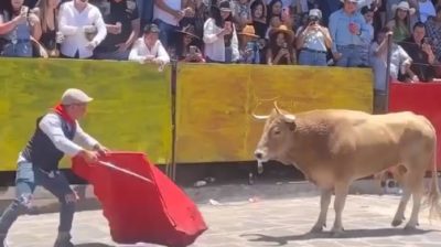 在通往墨西哥的道路上, 牛頭人以牛的表演並獲得了信心. 該名男子, 帶著他的紅色斗篷, 決定在動物疲倦後跪下. 但是第二隻公牛沖向他,把他送了幾米.