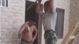 精品店裡的女售貨員正在午睡時躺在地板上,其中一人突然跳起來並開始尖叫. 一隻囓齒動物爬到了她的褲子下面. 她很害怕,試圖通過尖叫和跳躍來擺脫恐懼. 她的同事玩得很開心.