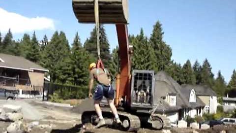 在一座建築, 一名工人非常幸運,一台起重機翻倒了,和他一起倒在他旁邊。.