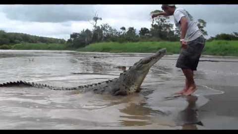 在哥斯達黎加的 Rio Tarcoles 河上餵鱷魚給遊客留下深刻印象, 發現了一個年輕人...