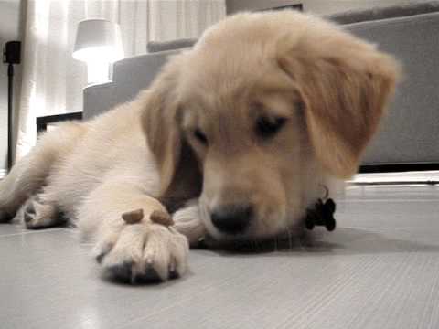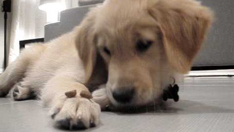 一隻9周大的金毛小獵犬竭盡全力抵抗腳上的美食誘惑. 但它是非常溫順.