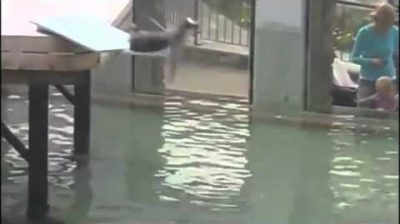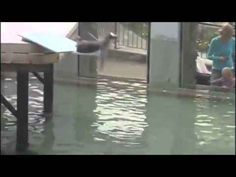 一個男人在湖中暢遊, 從一個大跳躍開始. 不幸的是他無法飛翔...