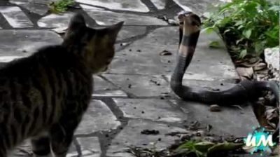 一隻貓,坐在餐桌旁,喝一些水, 但當有人獲取杯便出現混亂.