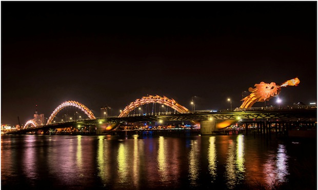 在紀念在越南戰爭結束以來的 38 周年紀念日, 峴港市展示了一座令人印象深刻的 666 米長的龍形橋. 龍橋頭釋放從他嘴裡的水與火.