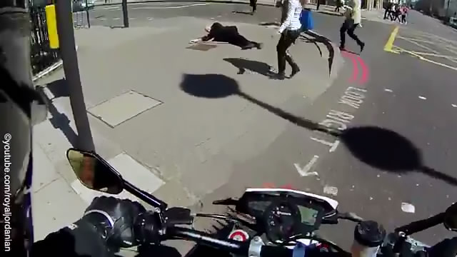皇家國家的電單車司機看到老人倒在人行道上和立即停止去説明他.